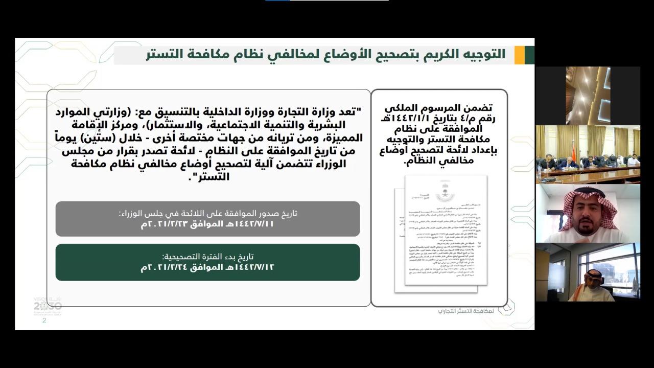 كما استمع الحاضرون إلى مداخلات كل من معالي تميم الجاسر مشرف عام إدارة المشاريع في البرنامج الوطني لمكافحة التستر التجاري ومعالي حمد العريفي مشرف عام إدارة المشاريع في البرنامج الوطني لمكافحة التستر التجاري ومعالي عبدالعزيز الشتري مدير مشاريع أول في البرنامج الوطني لمكافحة التستر التجاري.